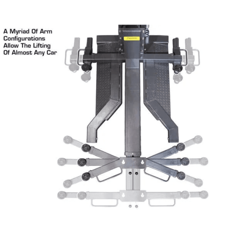 - Four Solid Steel-Scissor Support Bars – Among the strongest mid-rise lifts available.