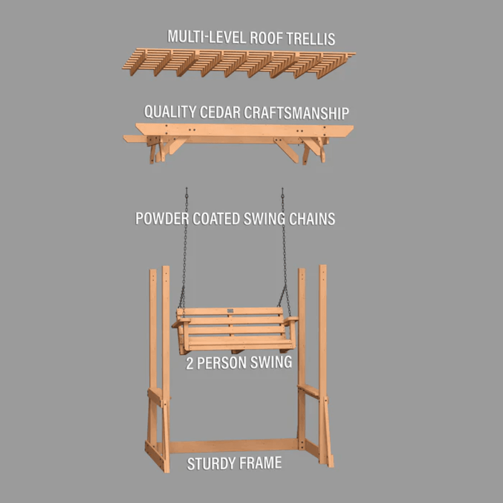 Crafted from 100% durable cedar wood, this classic pergola swing blends timeless aesthetics with superior strength. Featuring pre-cut and pre-drilled lumber for easy assembly, you can enjoy relaxation without the hassle. With a 600 lbs. weight capacity, this two-person swing provides a sturdy and serene way to unwind for years to come.