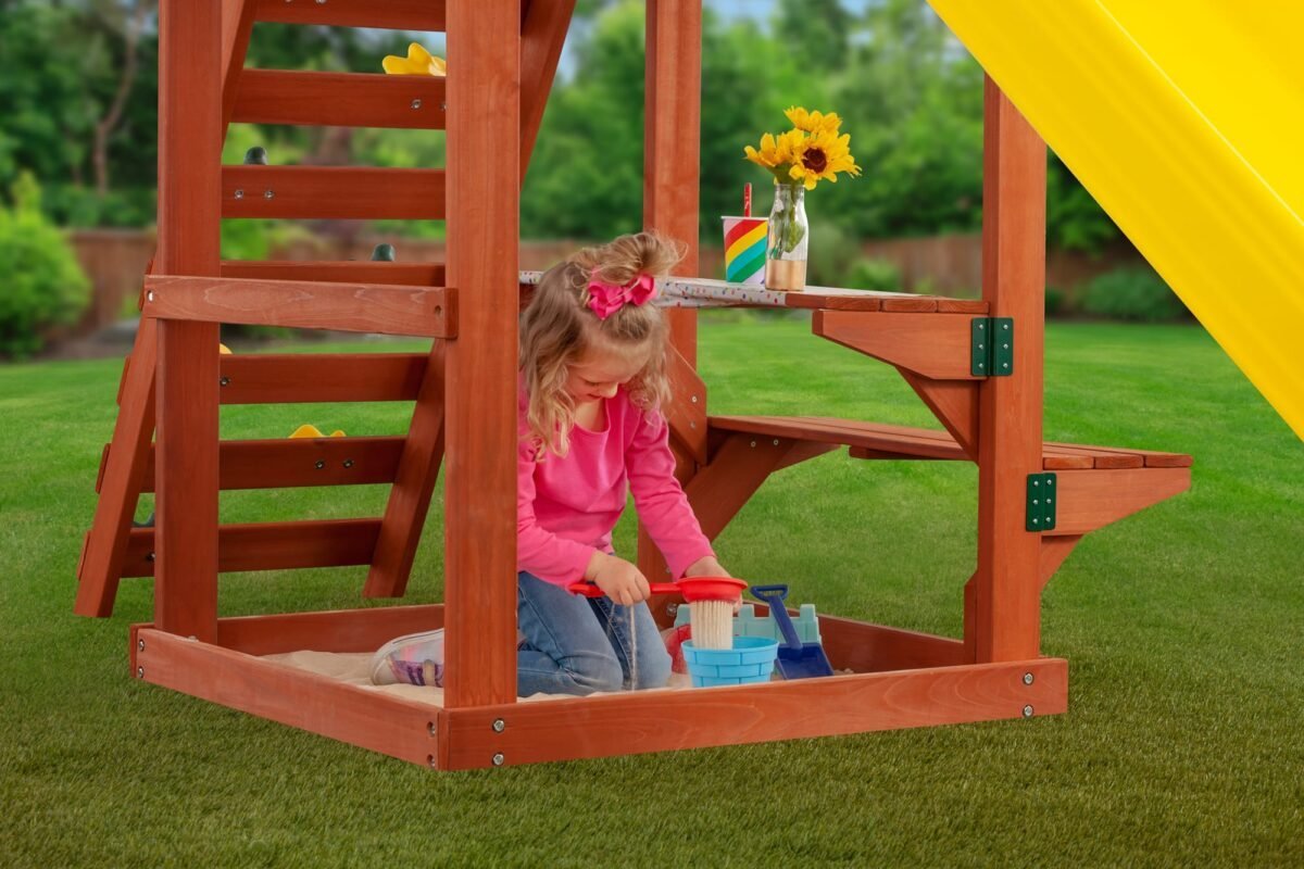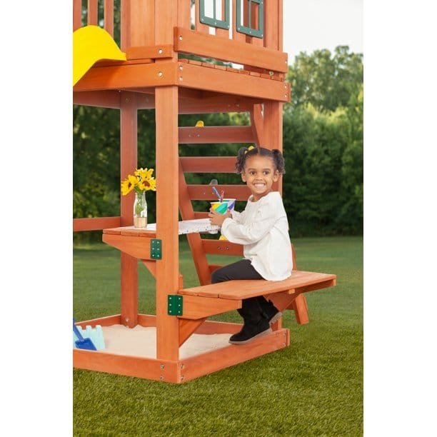 The tarp roof and awning cover the tower and provide shade for the picnic table below—perfect for tea parties or snacks in comfort. Kids can create sandcastles beneath the tower, steer a ship or racecar using the heavy-duty steering wheel, or jet down the slide to feel the wind in their hair.