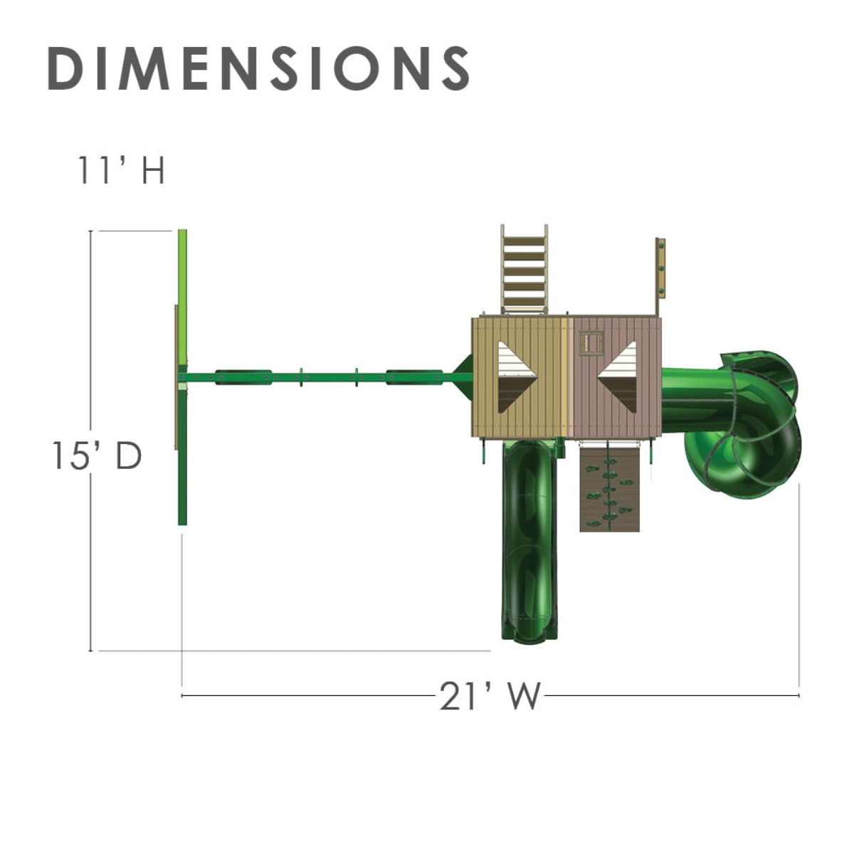 The rope ladder entry to the treehouse fort is the Mountaineer’s signature developmental feature. Unlike stair-access or ramp-access forts, rope ladder climbing requires grip strength, coordination, and problem-solving as children figure out the rhythm of ascending a flexible structure. This type of challenge builds functional upper-body strength and proprioceptive awareness in ways that flat-surface climbing cannot. The tube slide provides an enclosed, exciting descent from the upper deck that children use repeatedly and instinctively, reinforcing the climb-slide cycle that drives long-duration outdoor play sessions.
