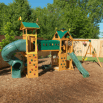 Adventure tower with a shaded canopy provides a cool spot for kids.