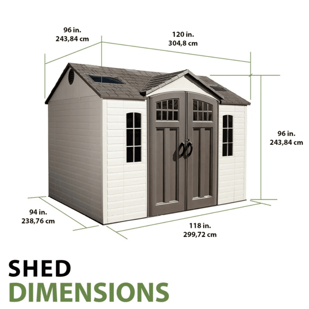 - Exterior Dimensions: 10 ft. W x 8 ft. D x 8 ft. H (3.05 m x 2.44 m x 2.44 m)