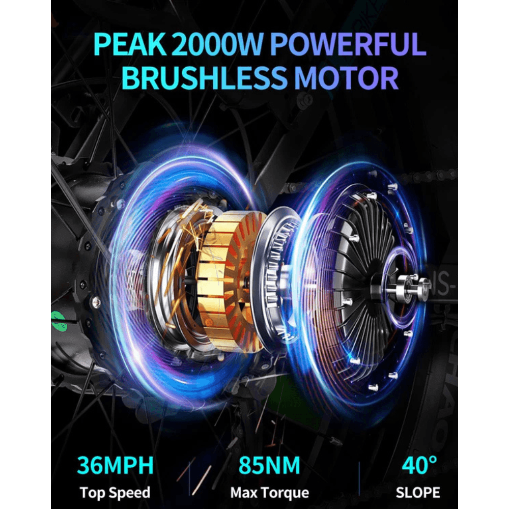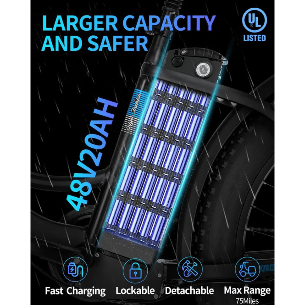 - Long-Range Battery: The 48V/20AH waterproof battery powers you for 75–90 miles on a single charge, with a removable design for easy charging and enhanced safety.