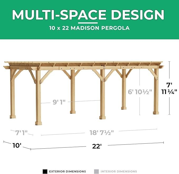 The 10′ x 22′ Meridian Pergola will add a dramatic new decorative dimension to your outdoor space. This Pergola provides enough room underneath for entertaining guests with multiple dining tables, a variety of attractive and comfortable seating arrangements or even a cocktail bar. It’s a great way to create a vacation resort-like experience at home.